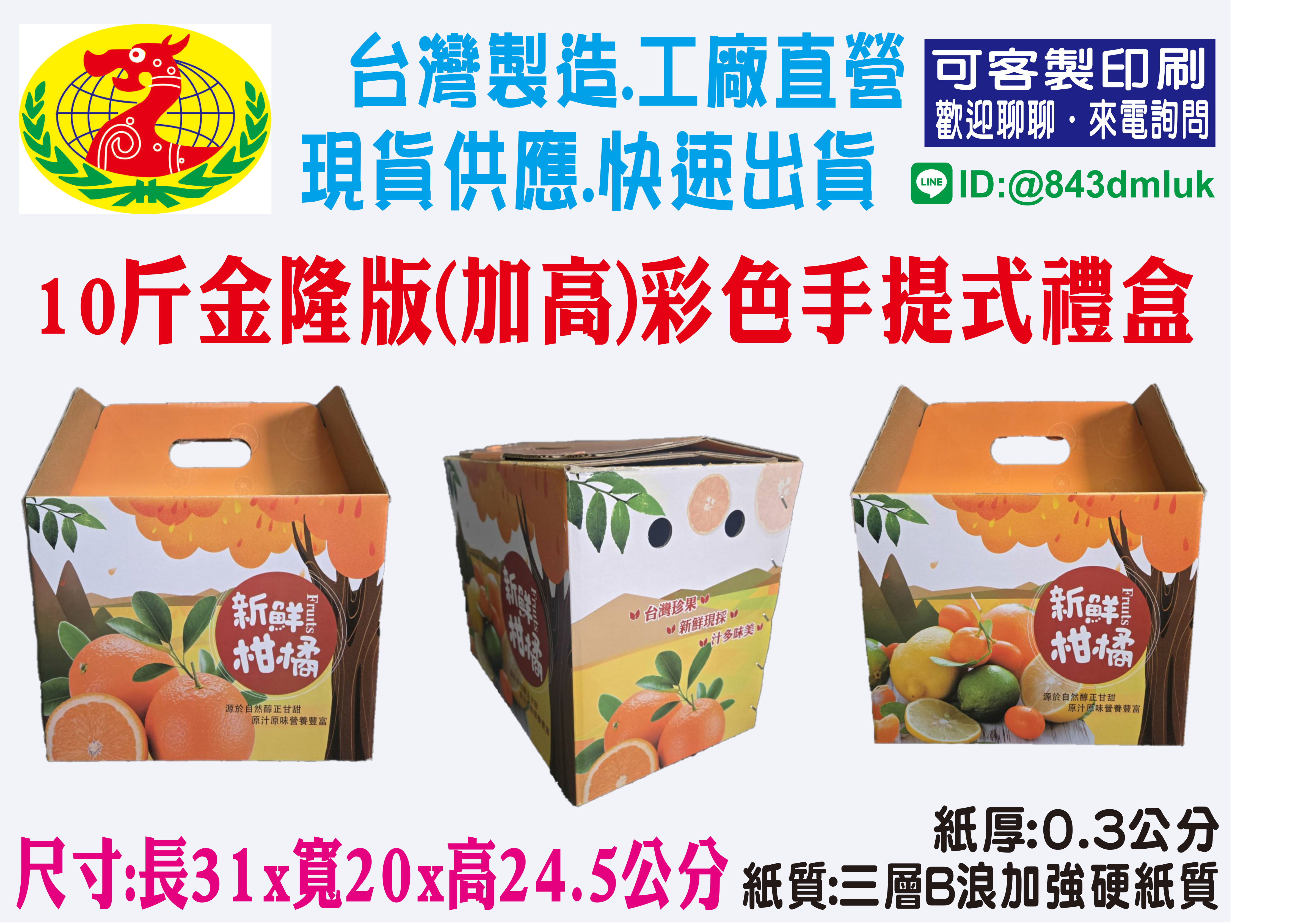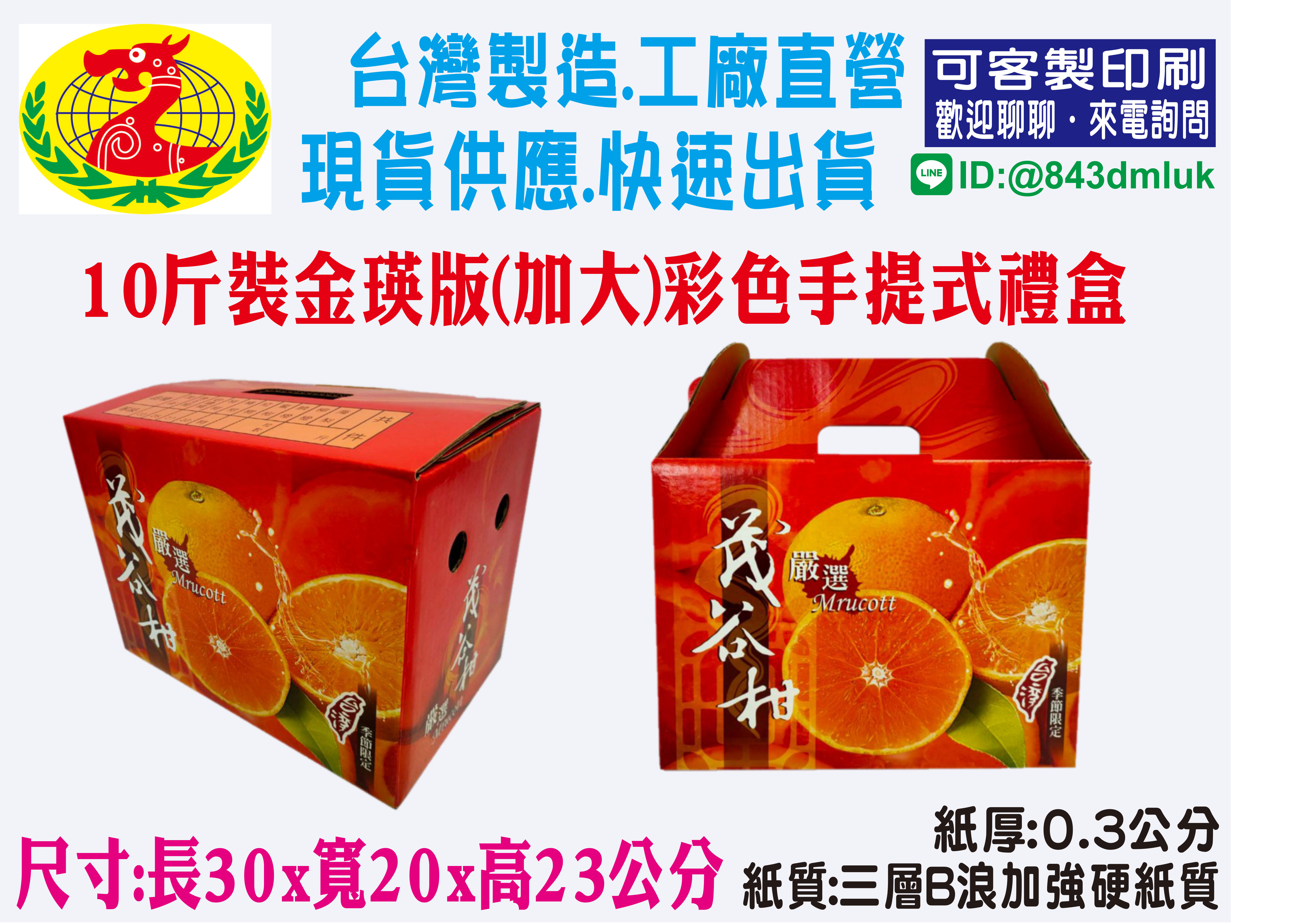| 10斤裝香甜柑橘手提式彩色禮盒 | 29.6X19.7X22.7CM | 29.3X19.4X22.2CM | 74.5CM | $27 | 1綑10只 | $270 |