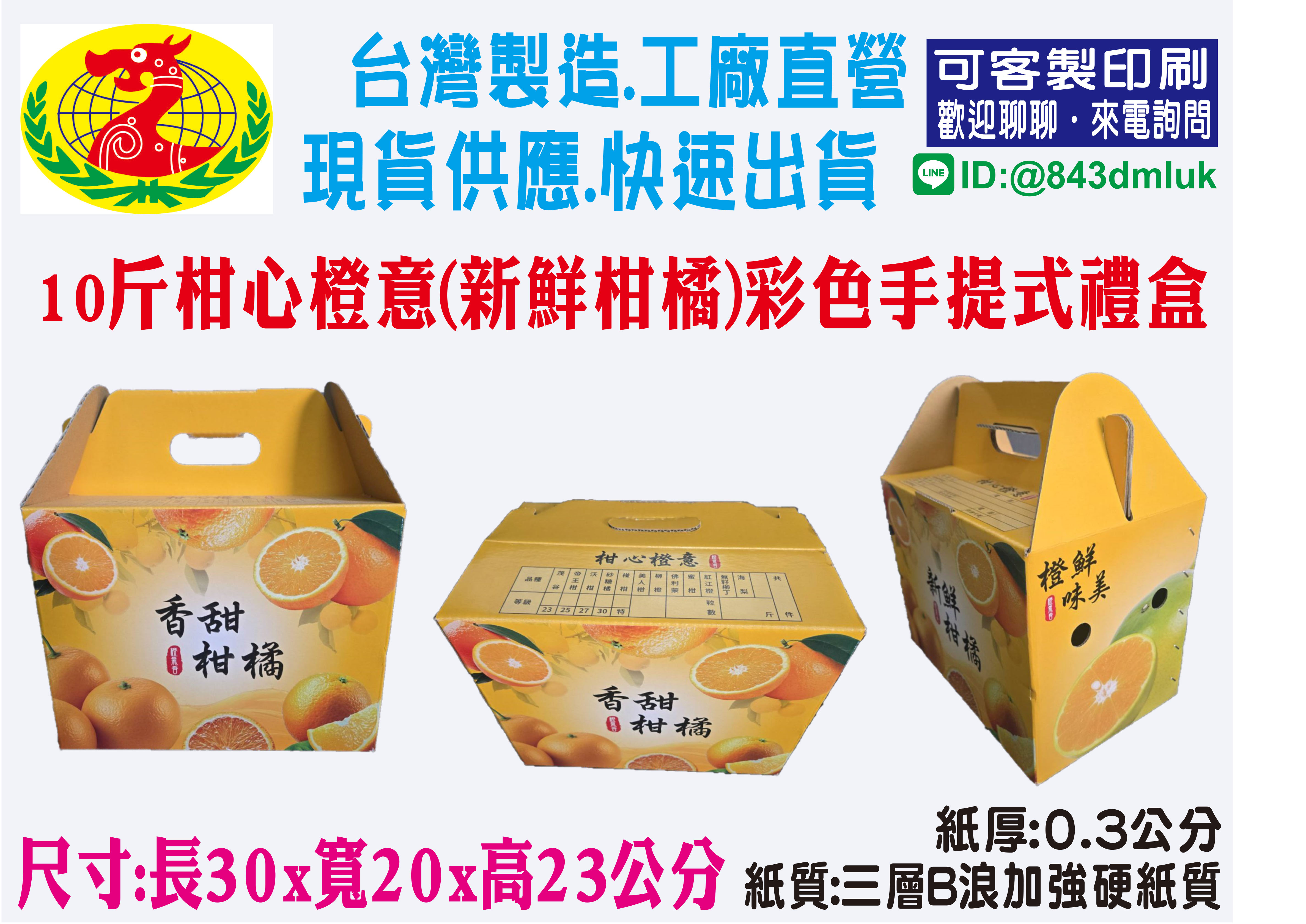 | 10斤裝香甜柑橘手提式彩色禮盒 | 29.6X19.7X22.7CM | 29.3X19.4X22.2CM | 74.5CM | $27 | 1綑10只 | $270 |