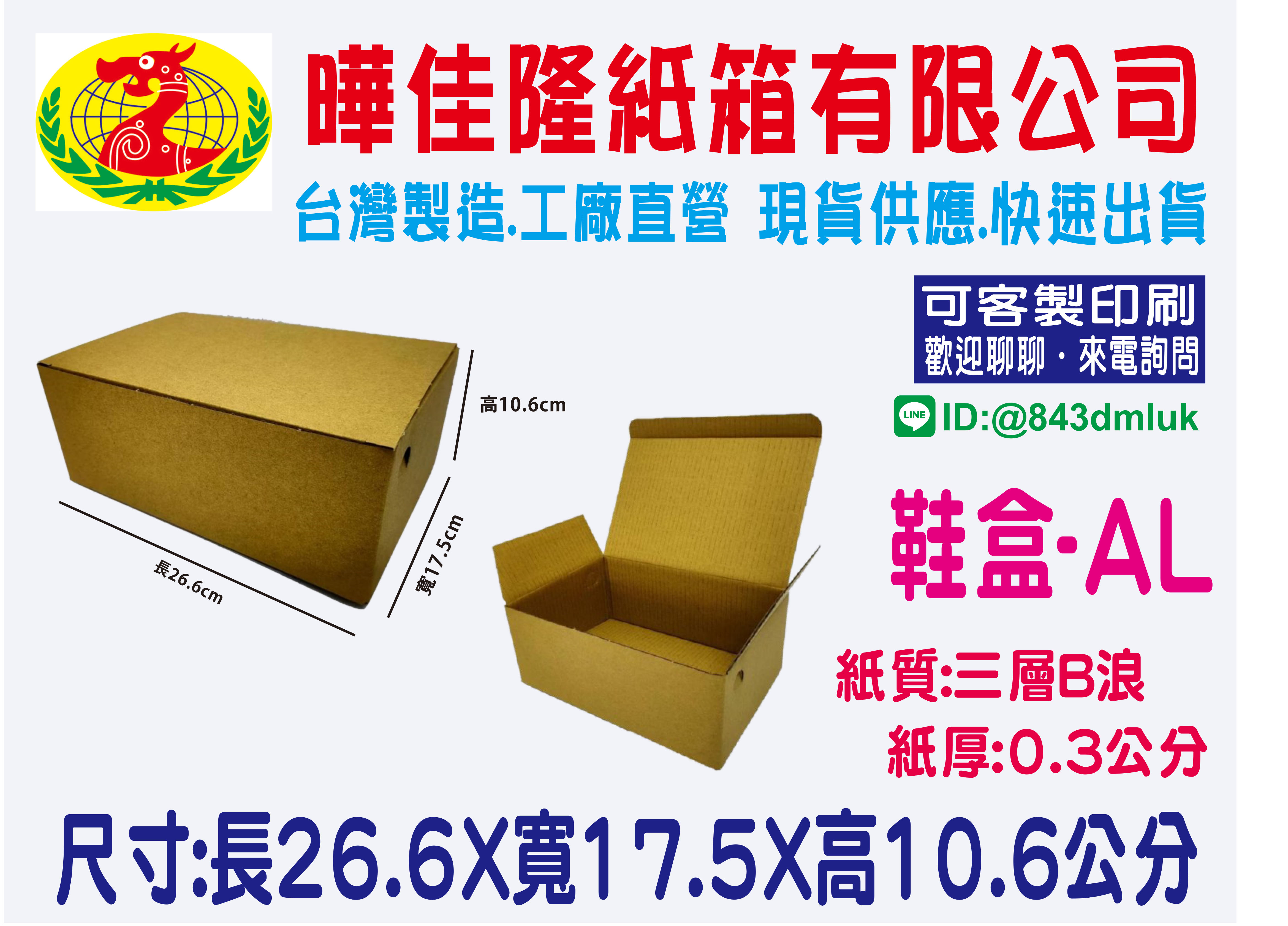 | 鞋盒AL-26.6*17.5*10.6CM | 26.6*17.5*10.6CM | 26.3*17.2*10.1CM | 55CM | $7 | 1綑50只 | $350 |