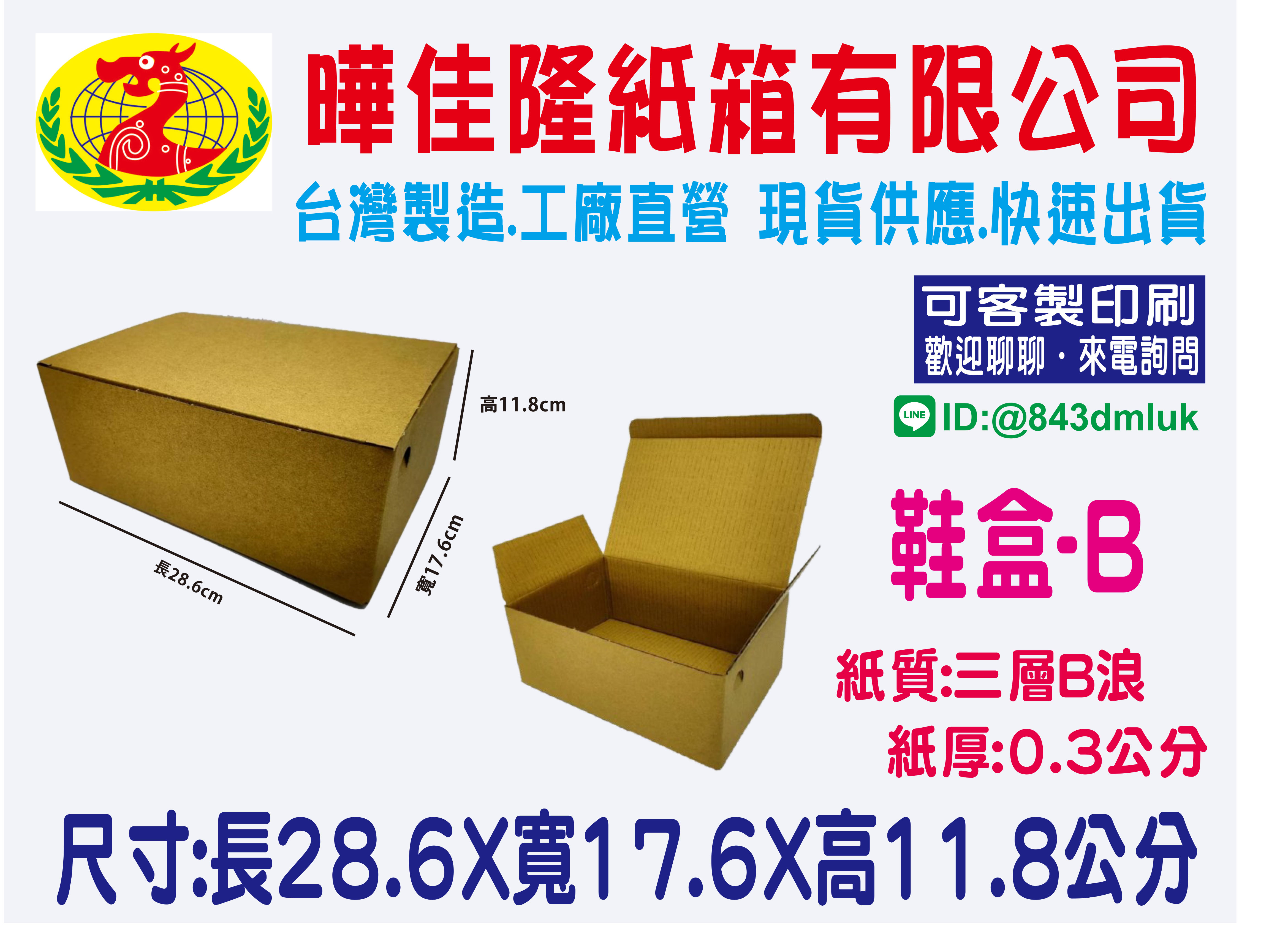 | 鞋盒B-28.6*17.6*11.8CM | 28.6*17.6*11.8cm | 28.3*17.3*11.3cm | 58cm | $8 | 1綑50只 | $400 |