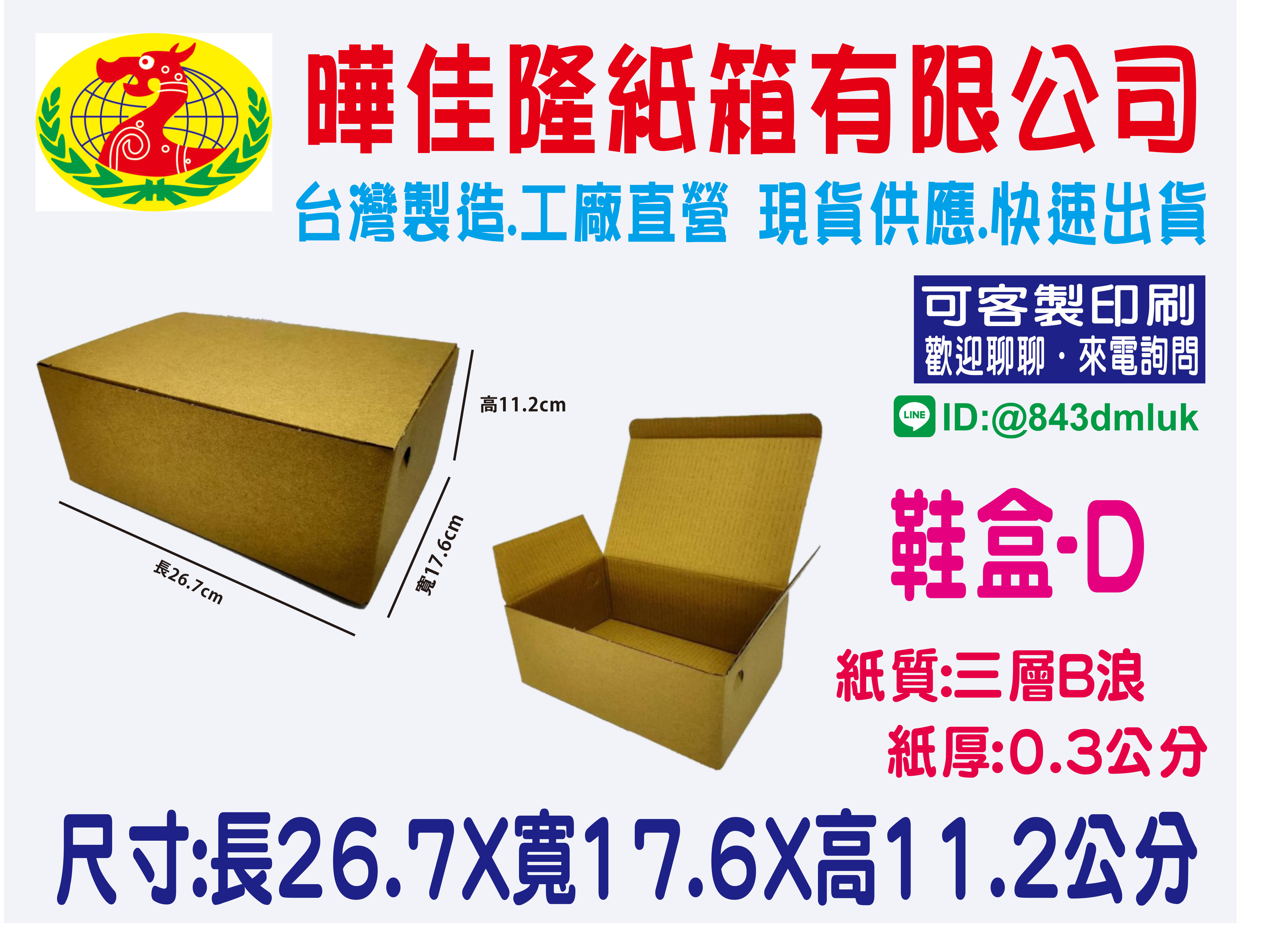 | 鞋盒D-26.7*17.6*11.2CM | 26.7*17.6*11.2CM | 26.4*17.3*10.7CM | 56CM | $7 | 1綑50只 | $350 |