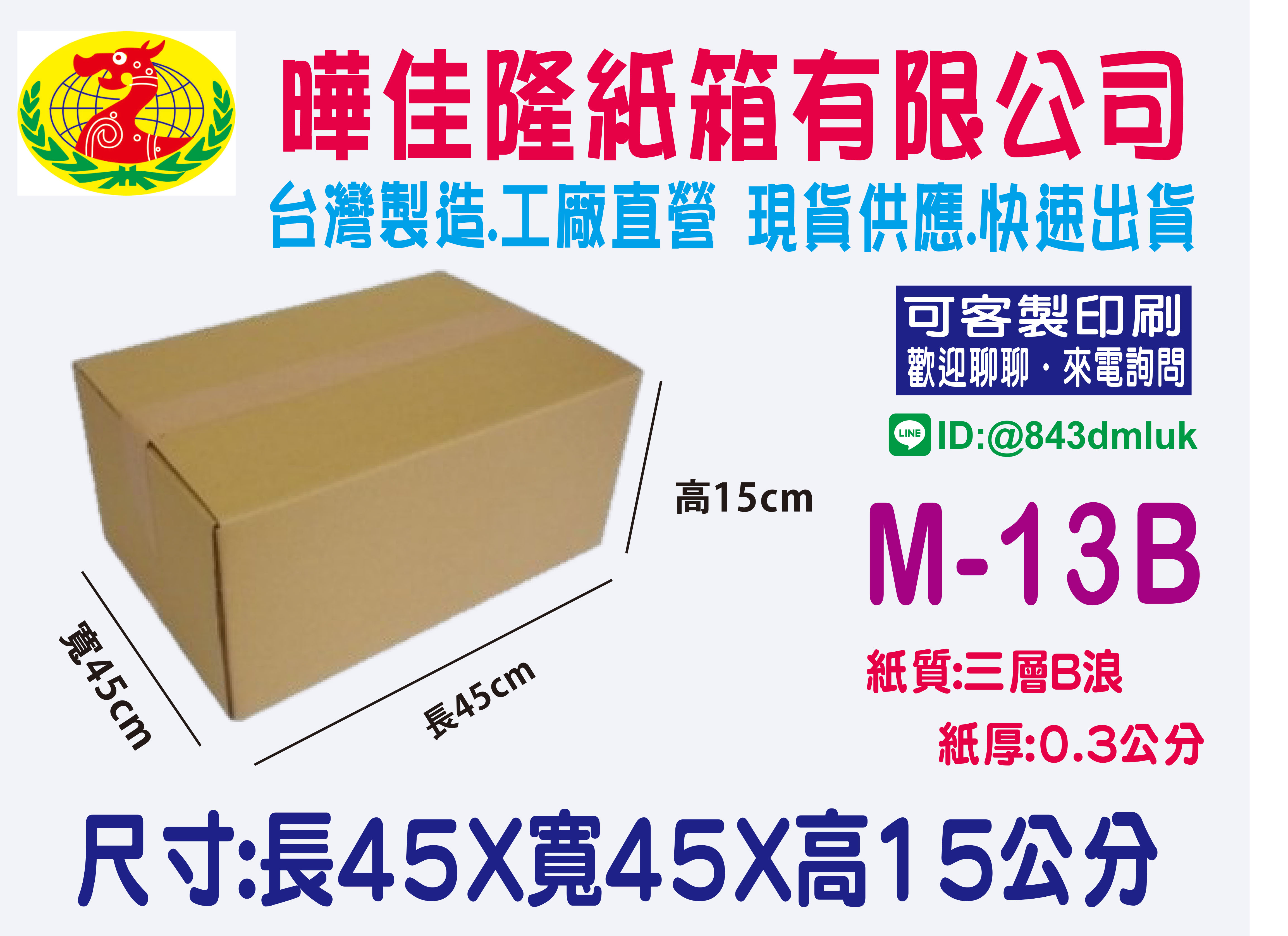 | M-13B 45*45*15CM三層牛皮紙箱 | 45*45*15CM | 44.7*44.7*14.5CM | 105CM | $20 | 1綑20只 | $400 |